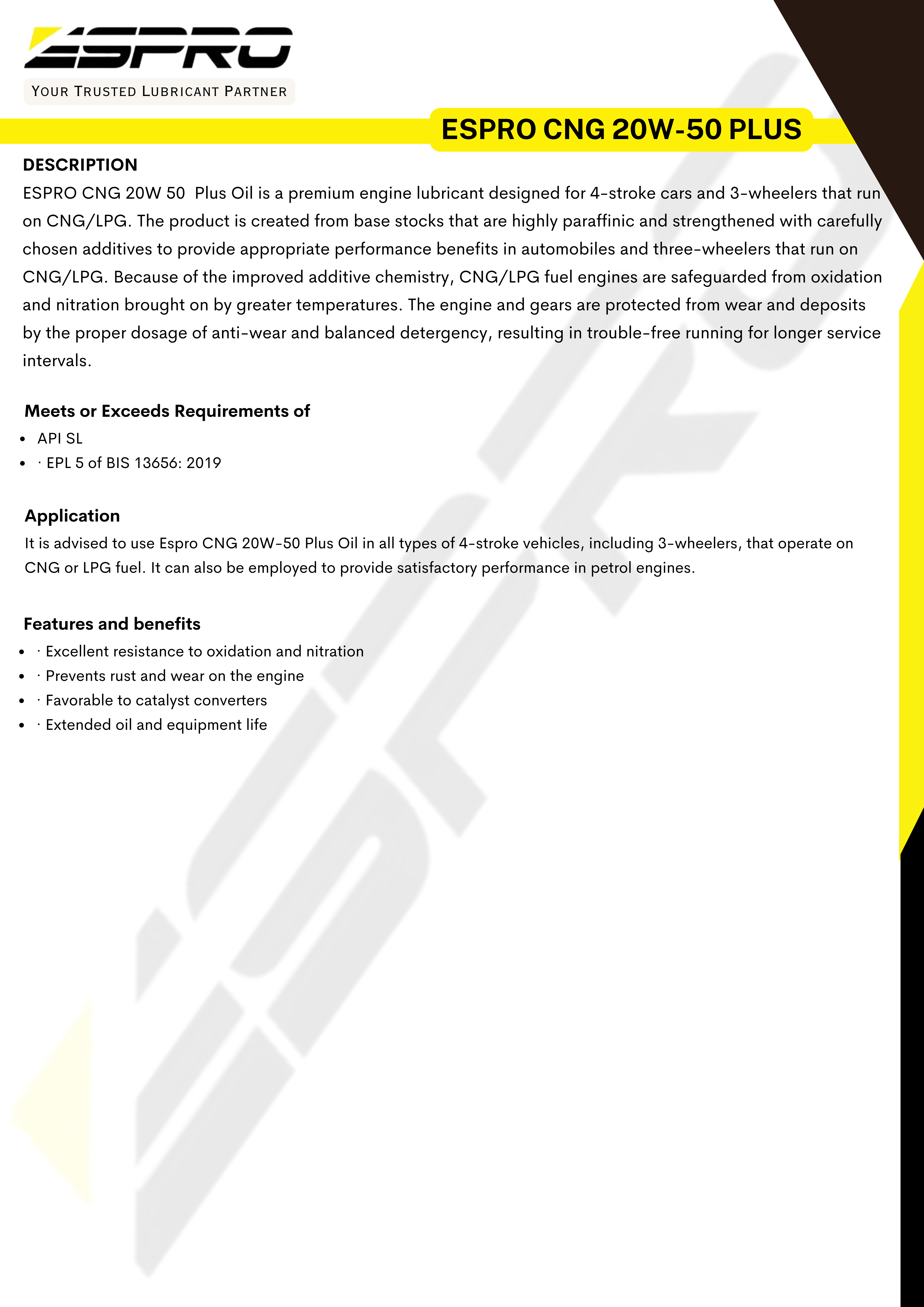It is advised to use Espro CNG 20W-50 Plus Oil in all types of 4-stroke vehicles, including 3-wheelers, that operate on CNG or LPG fuel. It can also be employed to provide satisfactory performance in petrol engines.